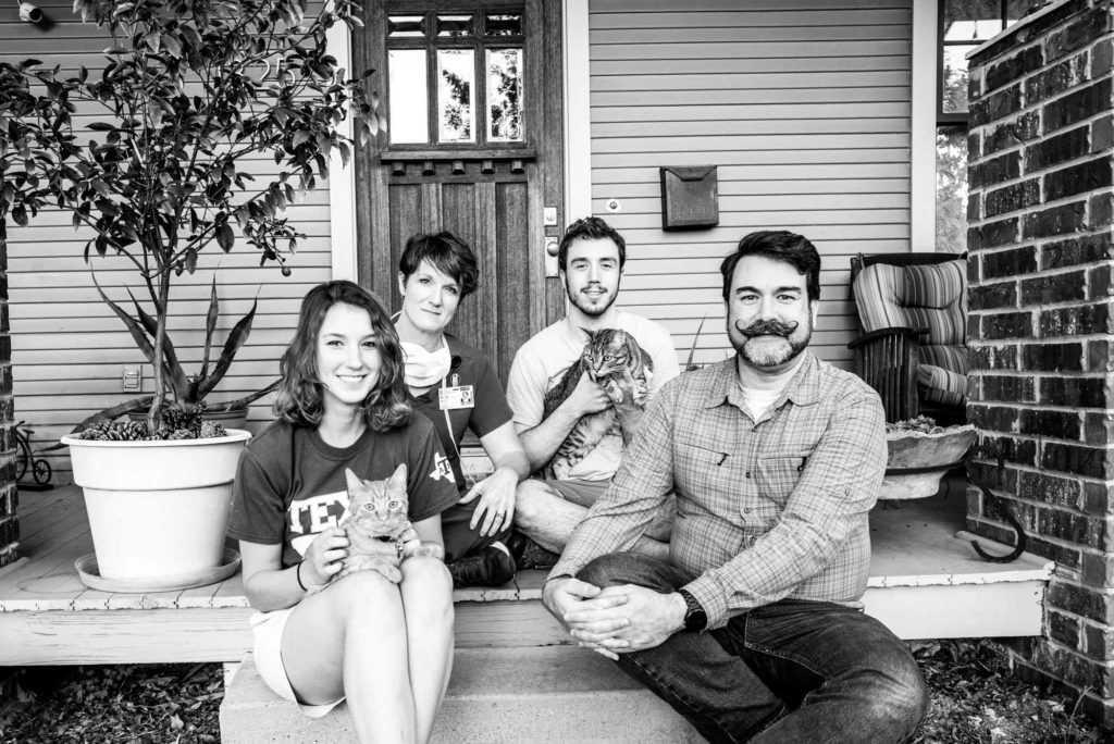 Paul works in IT at JPS doing computery things. I am an RN at JPS at the clinic serving our neighbors experiencing homelessness. I provide care for residents in the shelters and in our clinic by the shelters. \We both love having jobs with a real sense of mission to improve our community. Emory works at Heim for a college job and Anya works at Heim when home from Aggieland. The cats are lazy and refuse to work.